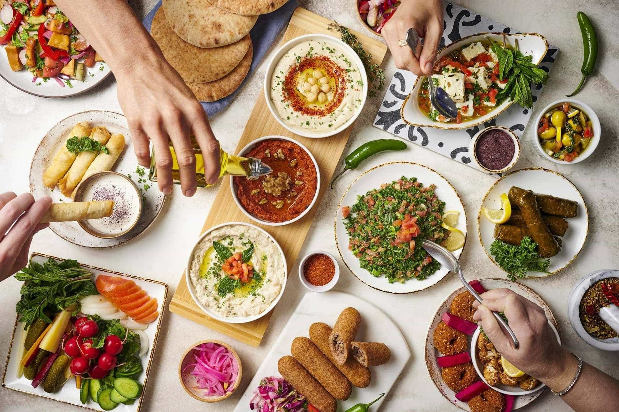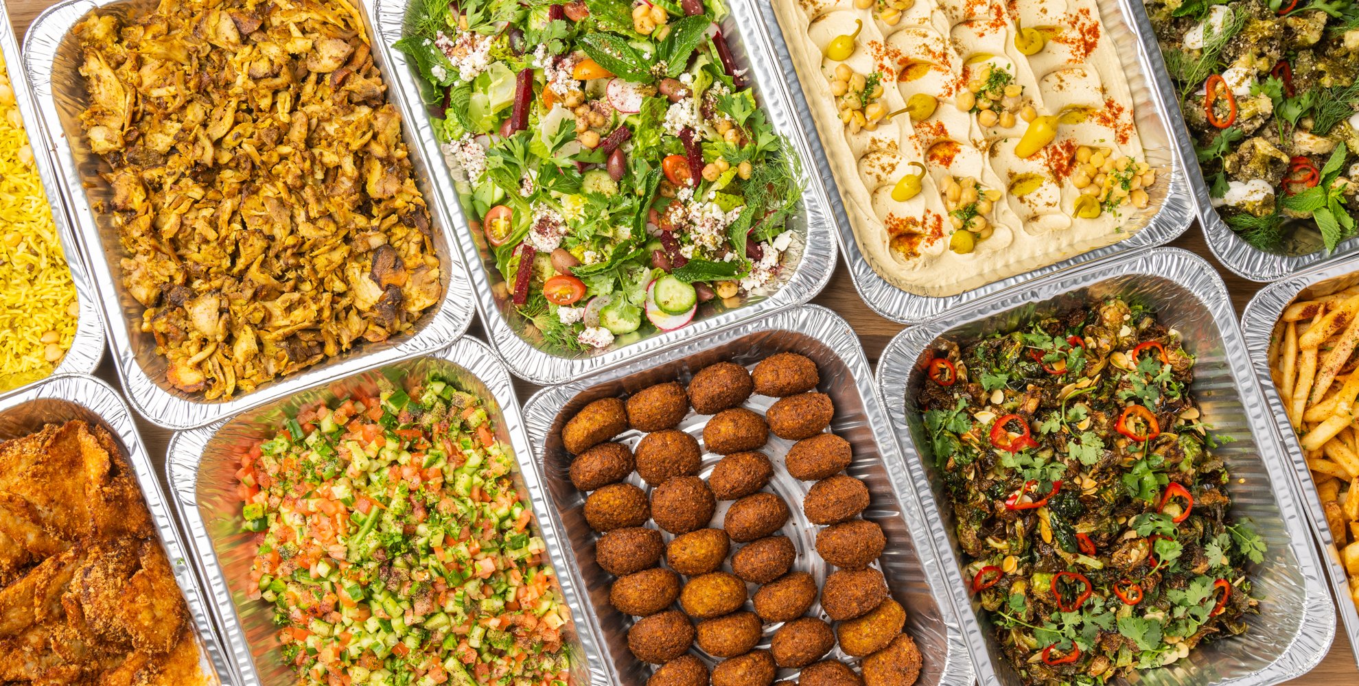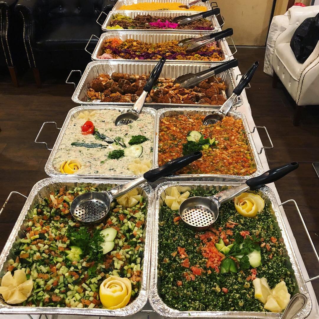 Chicken Kabob / Kafta Kabob / Rice / Hummus / Mediterranean Salad / Cucumber Yogurt Salad / Garlic Sauce / Pita Bread / Falafel / Baklava.